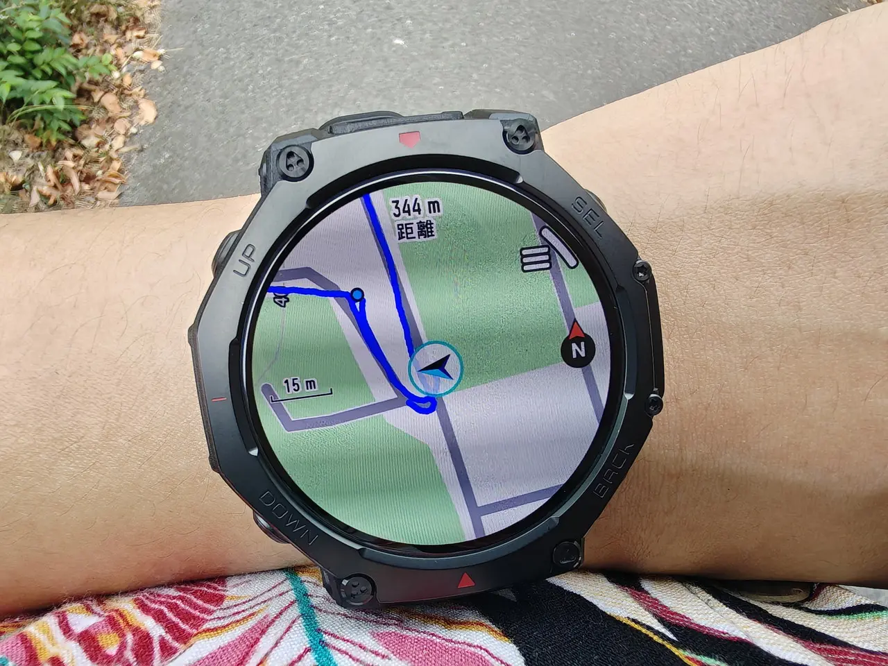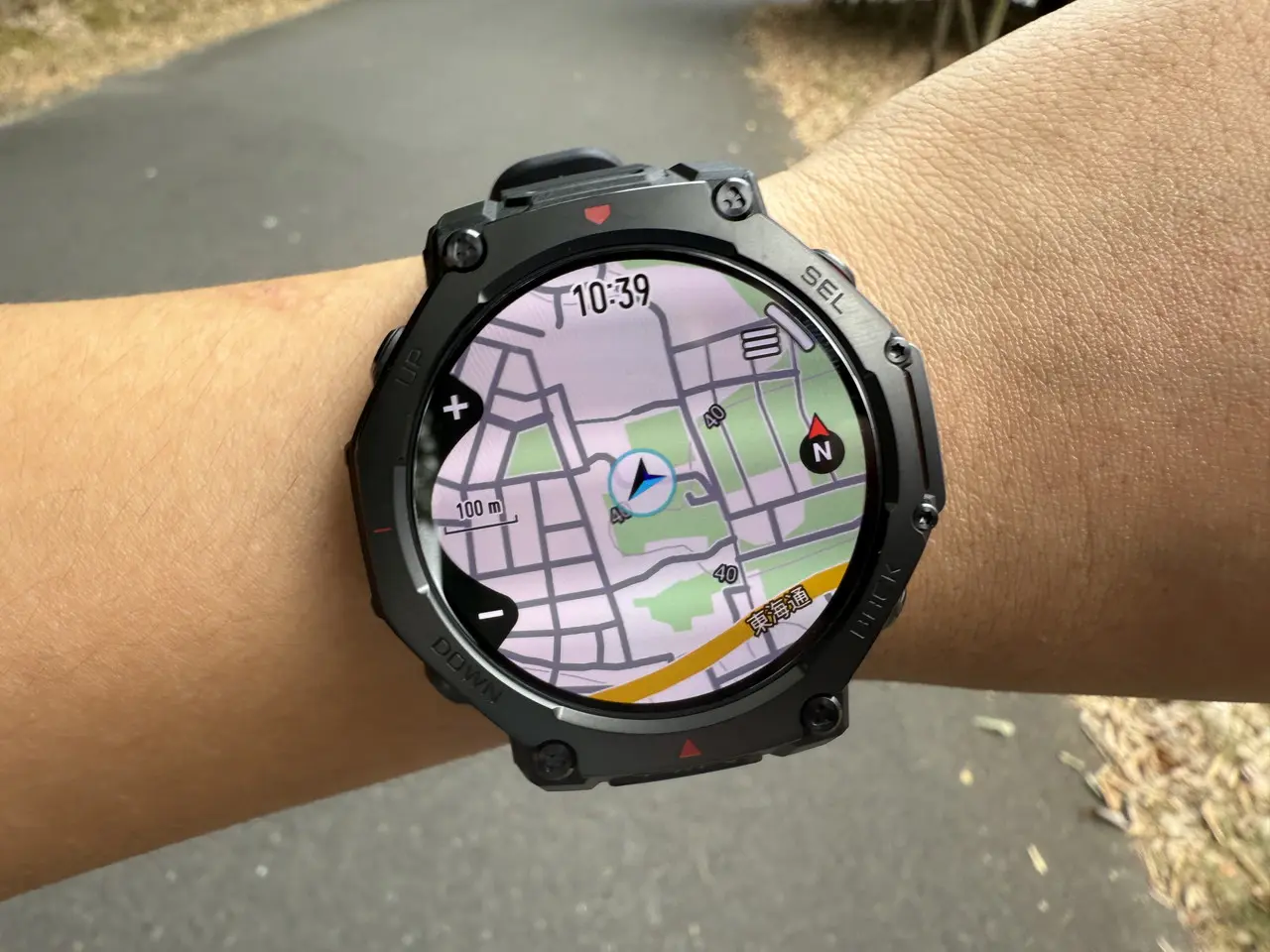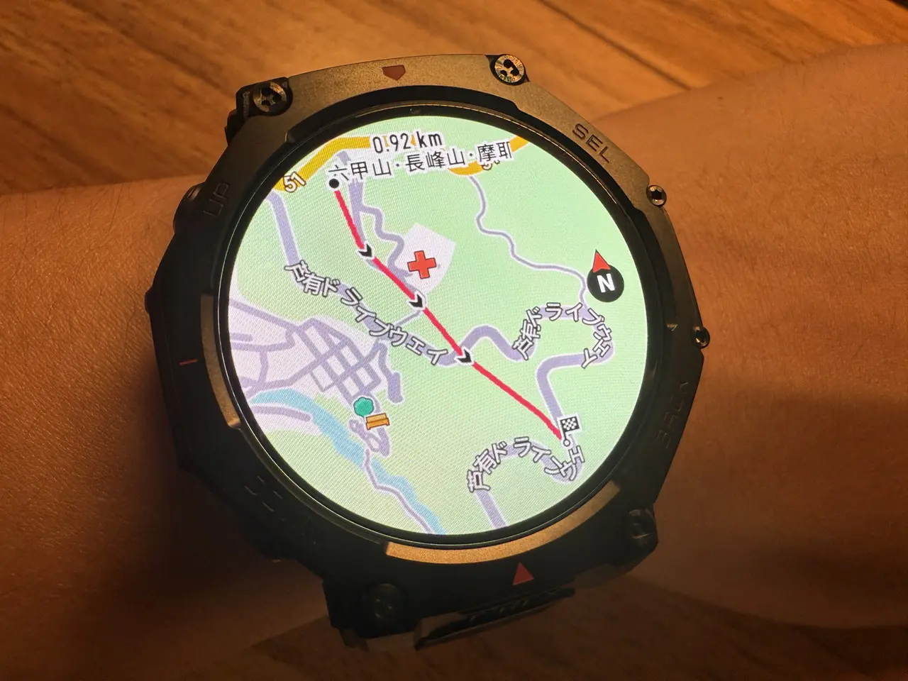 分岐や急カーブに差し掛かると、画面上に矢印と距離が表示され、進むべき方向を即座に確認できます。紙地図やスマホを取り出す必要がなく、手首を見るだけでルートを確認できるのは非常に快適でした。