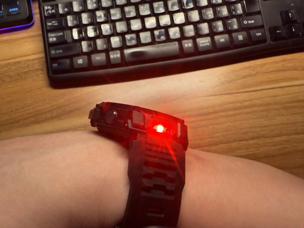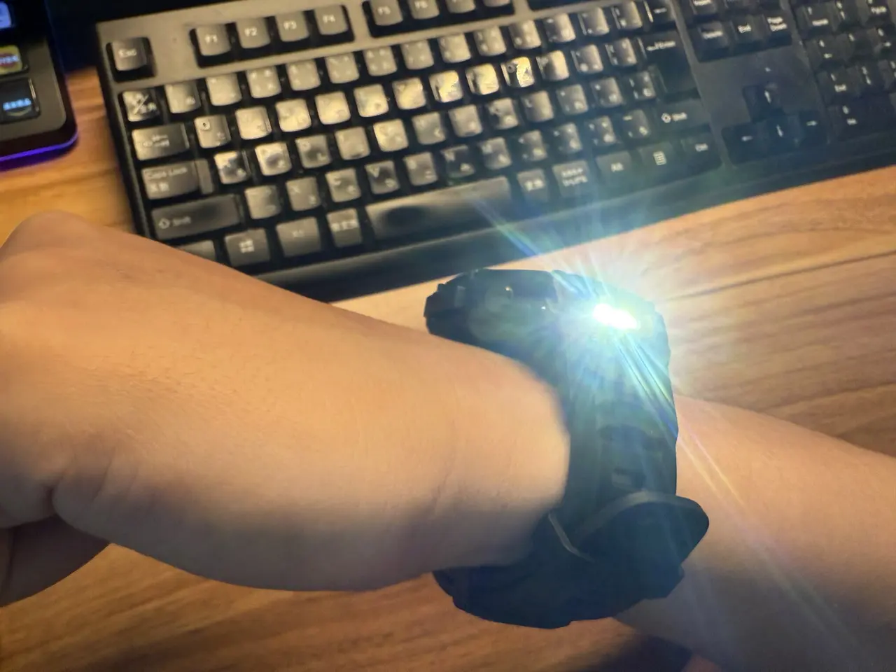ウォッチ上部(手首の奥にあたる部分)には懐中電灯が内蔵。白色光の明るさを3段階で調節できるほか、低干渉の赤色光と、緊急時に便利なSOS信号モードも搭載しています。