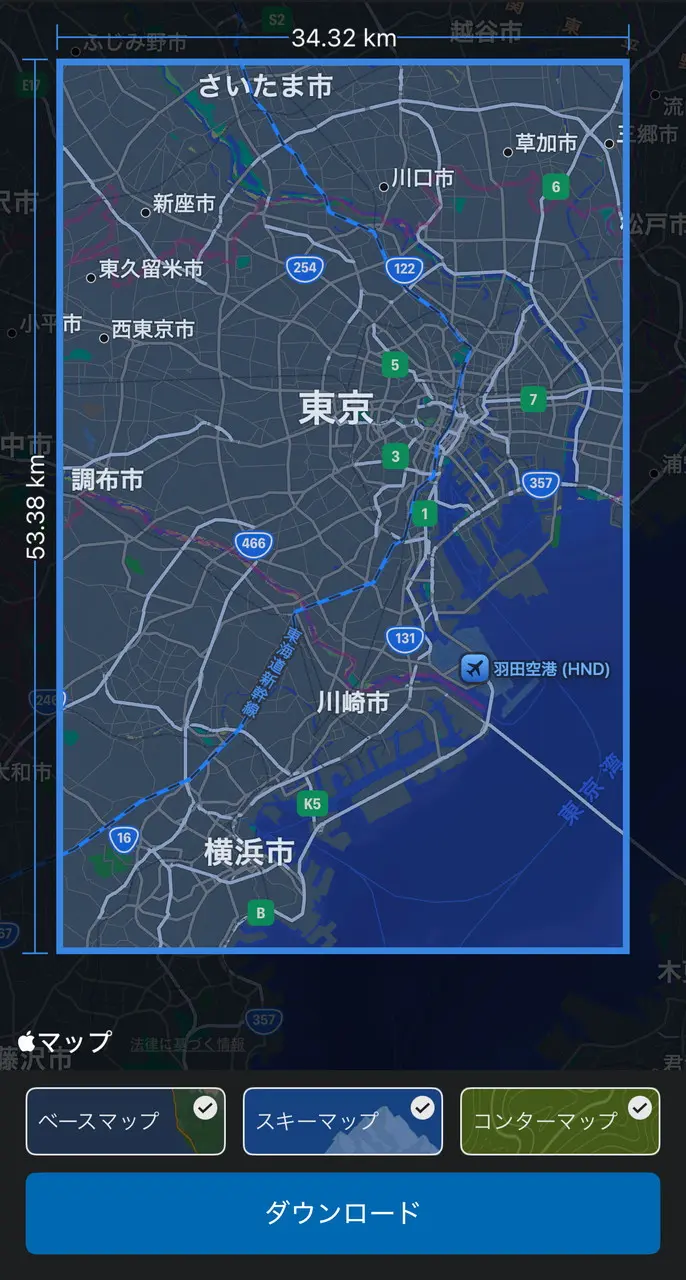 マップデータはアプリ経由でダウンロード可能。ベースマップ・スキーマップ・コンターマップの3種類から選択できます。