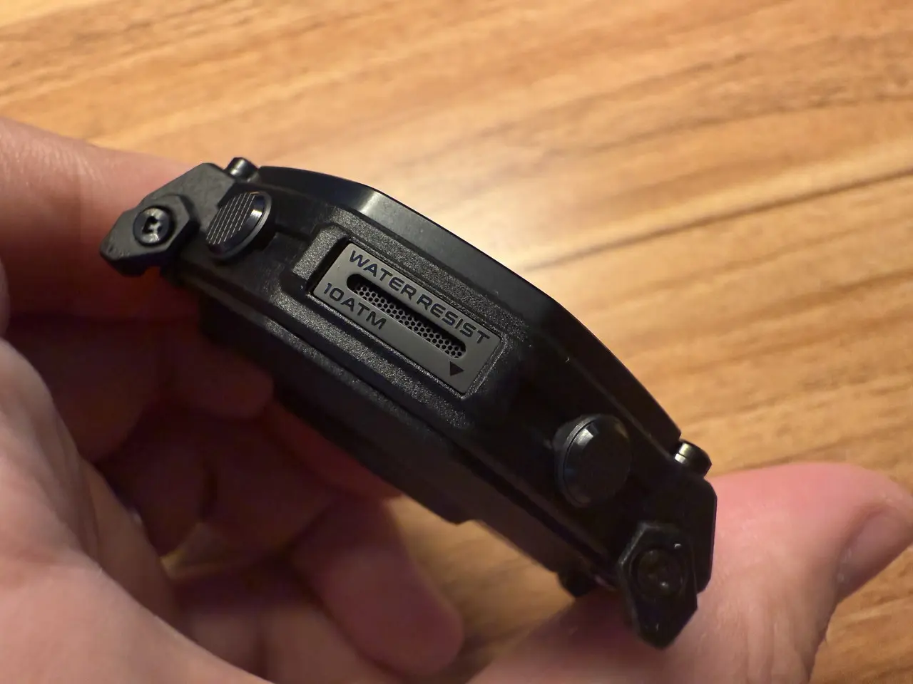 左側面にはスピーカー穴が用意。10ATM防水の表記も確認できます。