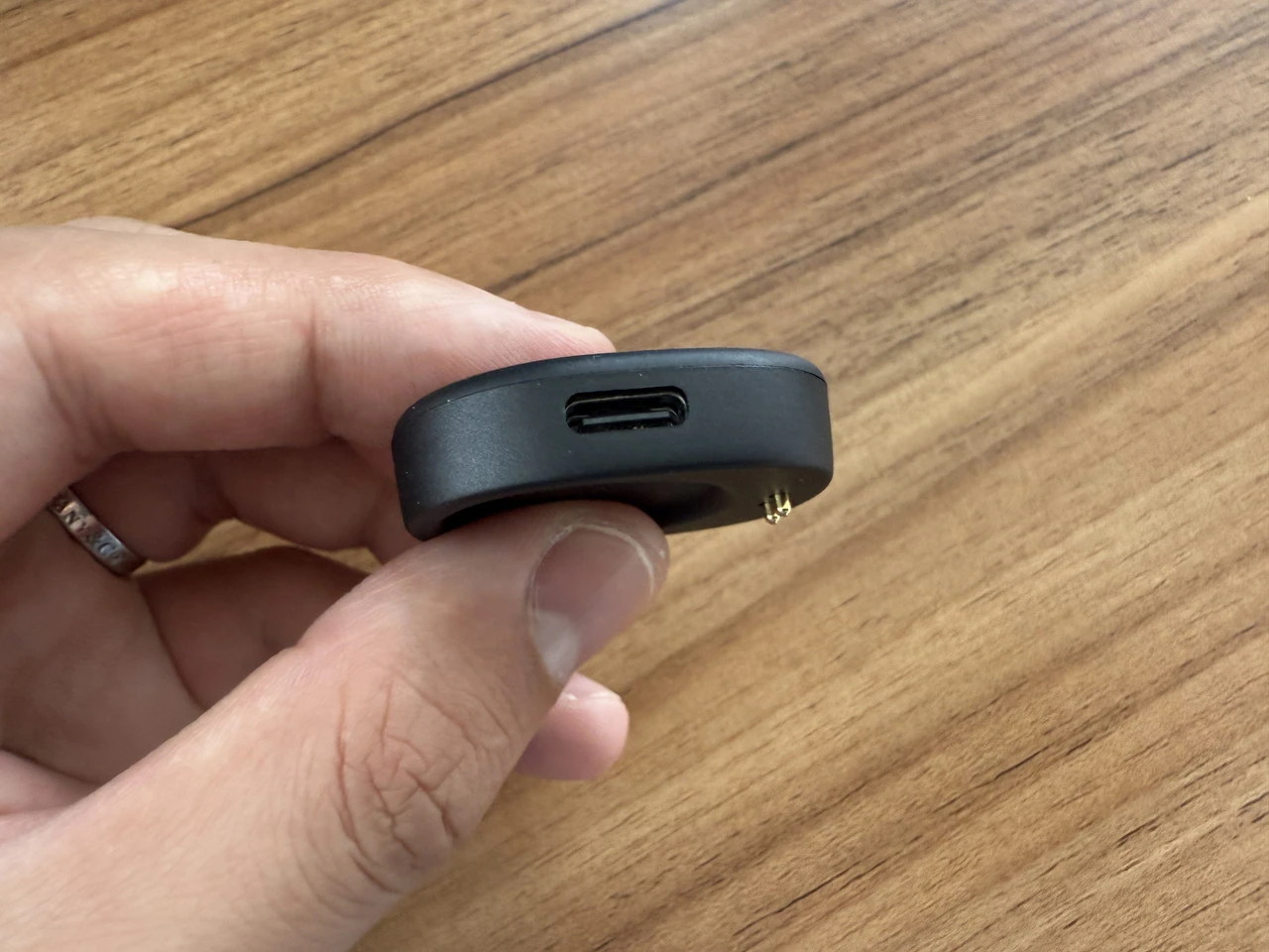 ▼裏面の手首にあたる部分には、装着者の生体情報を読み取る端子と、充電ポートが用意。