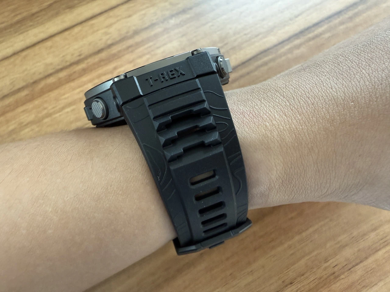 『Amazfit T-Rex 3』の装着感は実に快適であり、液体シリコン素材のストラップが手首へ柔軟にフィットする。