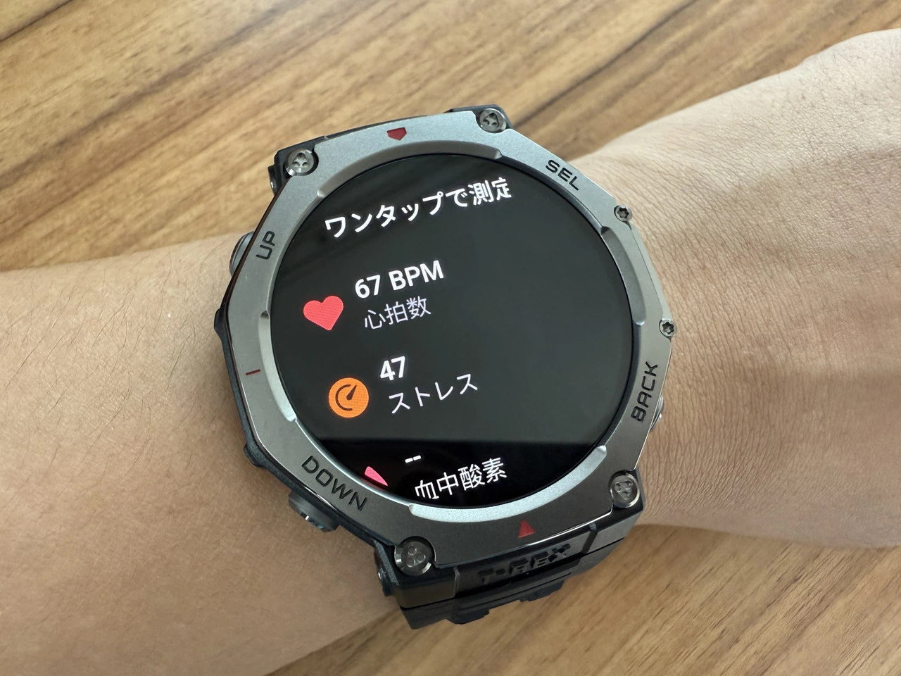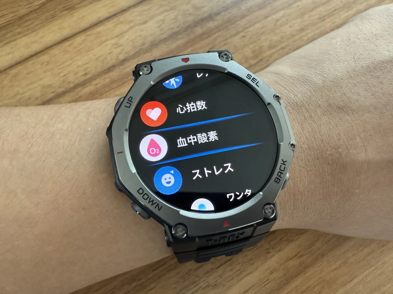 搭載機能は前モデル(Amazfit T-Rex 2)よりも充実しており、心拍数や消費カロリーの計測といったヘルスケア機能はもちろん、血中酸素レベル測定や睡眠モニタリングなどの健康管理機能をもれなく利用可能だ。