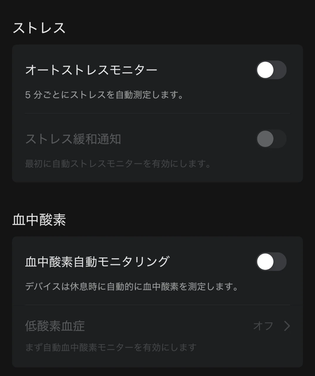 本製品には健康モニタリング機能が備わっており、ストレス・睡眠・心拍数・血中酸素飽和濃度などの数値を24時間監視(トラッキング)し、データとして可視化・保存しておくことが出来る。