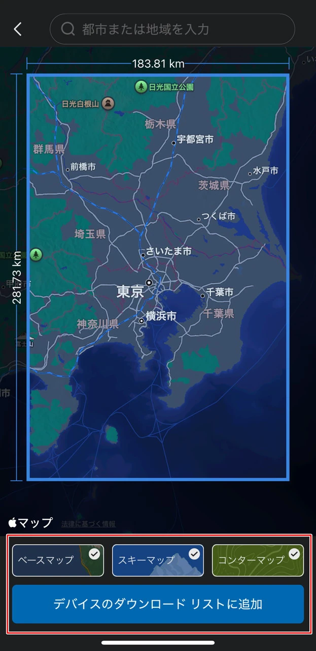 オフライン環境でも使えるマップデータを無料でダウンロード可能。ベースマップ、スキーマップ、コンターマップの3種類から好みのマップを保存できるため、運動時のルート案内から、アウトドアアクティビティの際の位置確認まで、幅広い場面で活用する。