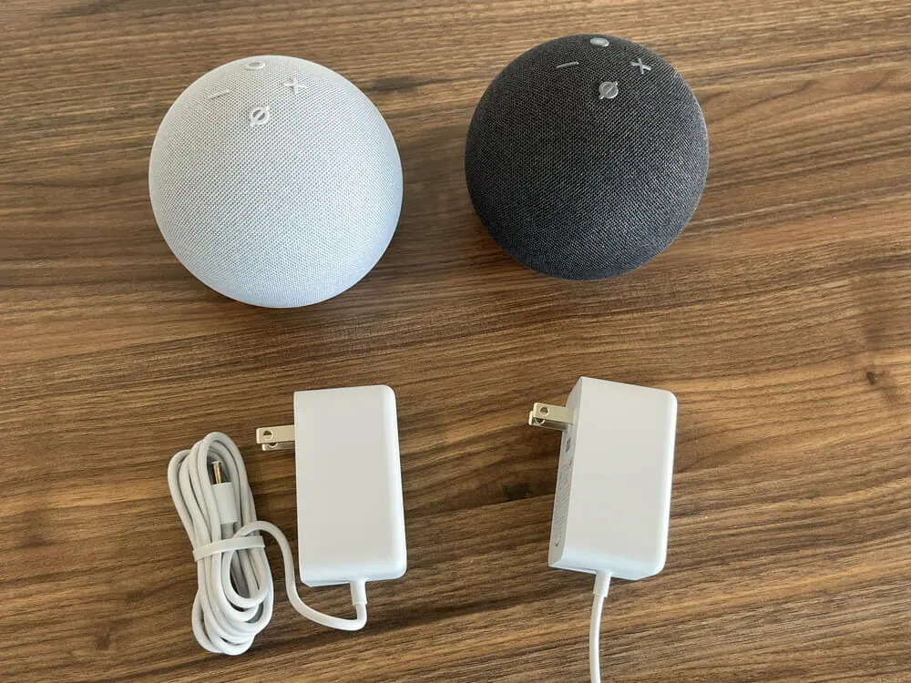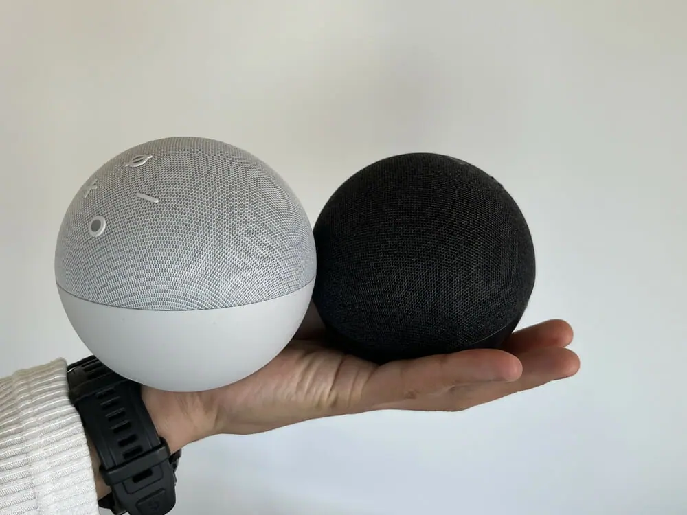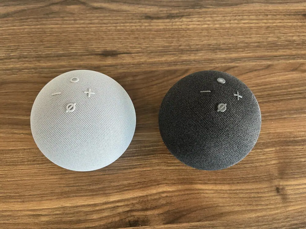 ▼第4世代Echo Dot(右・黒)と 第5世代Echo Dot(左・白)。