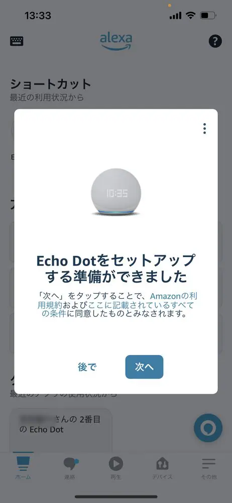アプリを起動すると、付近のEcho Dotが自動で検知され、セットアップ手順に入る。