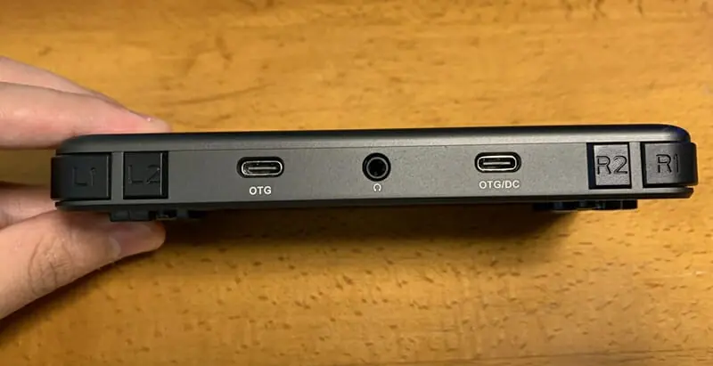 ▼本体上部には、画像左からL1/L2トリガー、OTGポート、イヤホンジャック、OTG/DCポート、R1/R2トリガーが用意。
