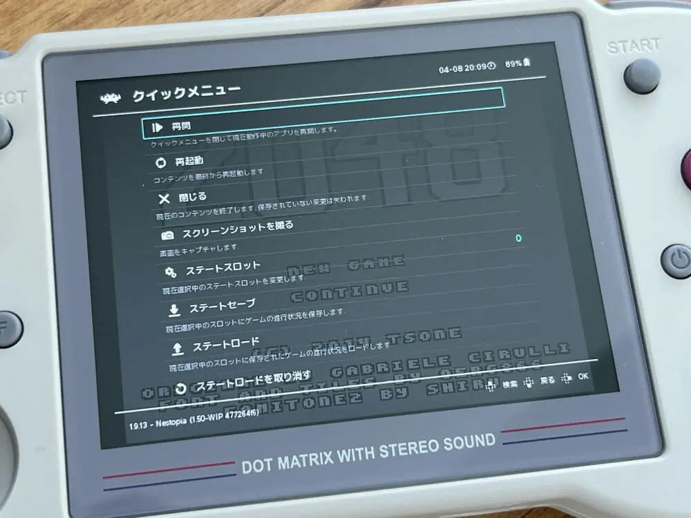 ▼なお、ゲーム中にメニューボタンを押すことで、ゲームの中断や再起動、途中セーブ、BIOSの起動などを行うことが出来る。