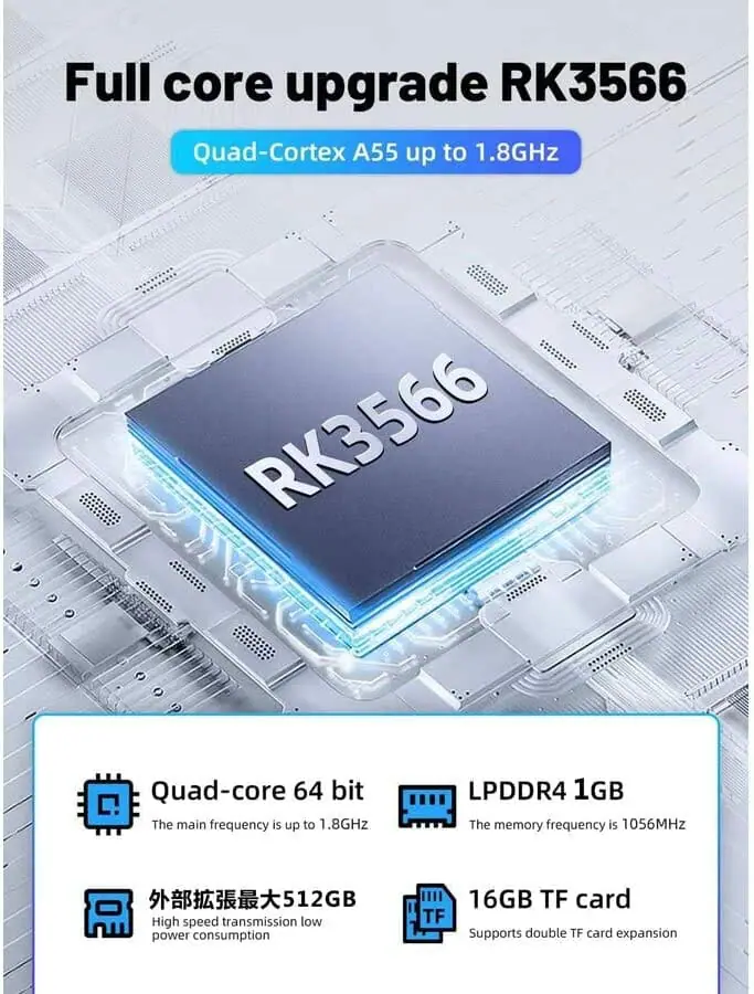 | CPU | RockChip RK3566 Quad-Core 64 bit Cortex-A55, メイン周波数最大1.8GHz |