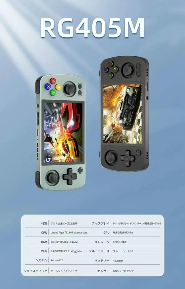 そこで今回オススメするのが、コンパクトな筐体サイズでゲームアプリや、プレイステーションやゲームボーイアドバンスなどのレトロゲームを遊ぶことのできる、高性能な携帯ゲーム機『ANBERNIC RG405M』である。