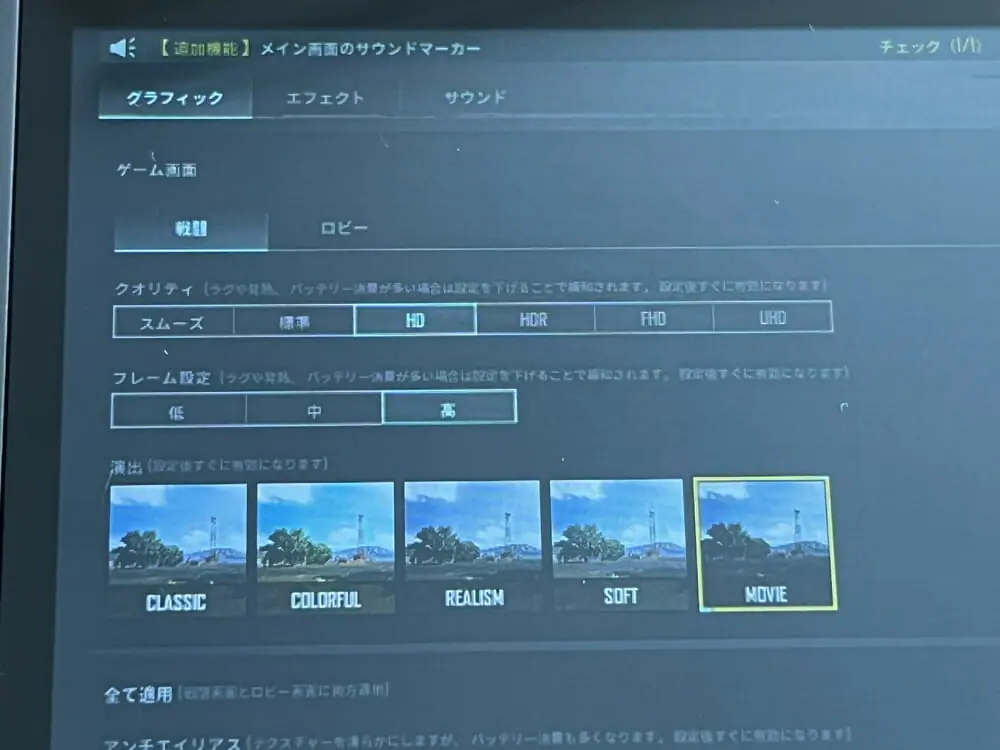 PUBGの場合、グラフィック品質は "HD" まで、フレーム設定は "高" まで選択できた。