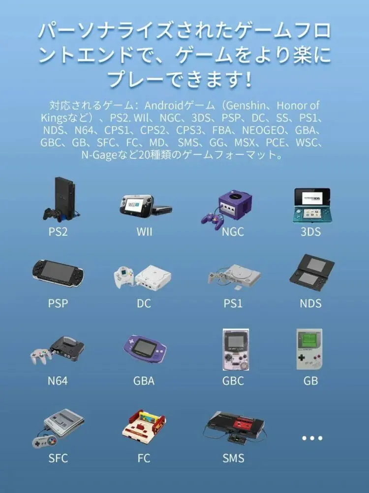 | 対応ゲーム | Androidゲーム(genshin impact, Honor of Kingsなど)、PS2、WII、NGC、3DS、PSP、DC、SS、PS1、NDS、N64、CPS1、CPS2、CPS3、FBA、NEOGEO、GBA、GBC、GB、SFC、FC、MD、SMS、GG、MSX、PCE、WSC、N-Gageなど20種類以上フォーマットのゲーム。ユーザーは関連するフォーマットのゲームを自分でダウンロード可能 |