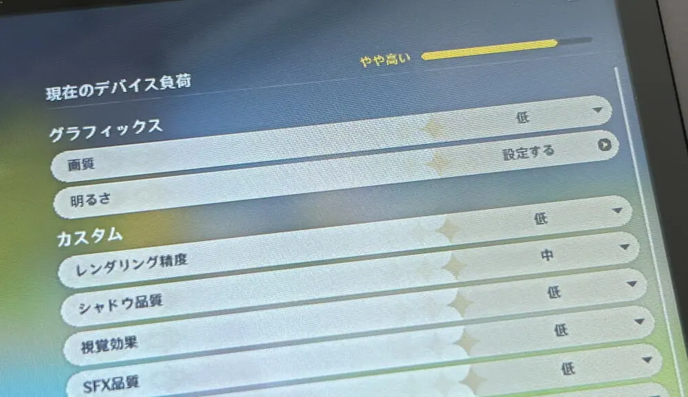 ▼画質設定を "低" に上げるとデバイス負荷が "やや高い" となるが、この状態でもフレームレート低下をほとんど感じることなくプレイすることが可能であった。