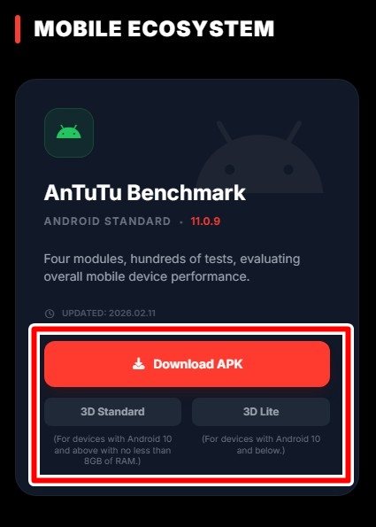 続いて、「Download APK」をタップして『AnTuTu Benchmark』本体データをダウンロードします。また、必要に応じて『3D Standard』(Android 10以降)もしくは『3D Lite』(Android 10以前)も一緒にダウンロードしましょう。