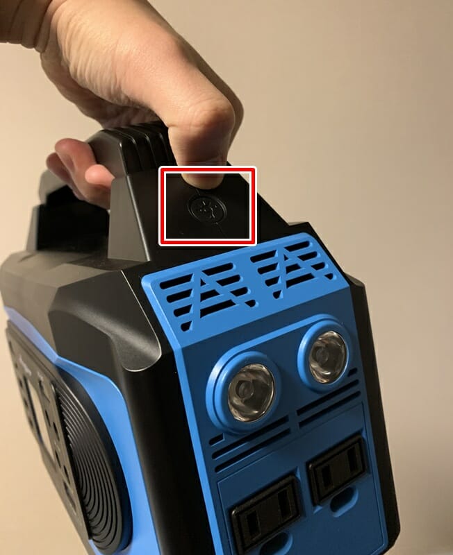 ▼側面にはAC電源(コンセント)および、非常時用のライトが2機搭載。