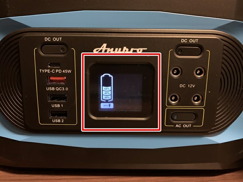 ポータブル電源自体の充電残量は、正面モニターに表示される。