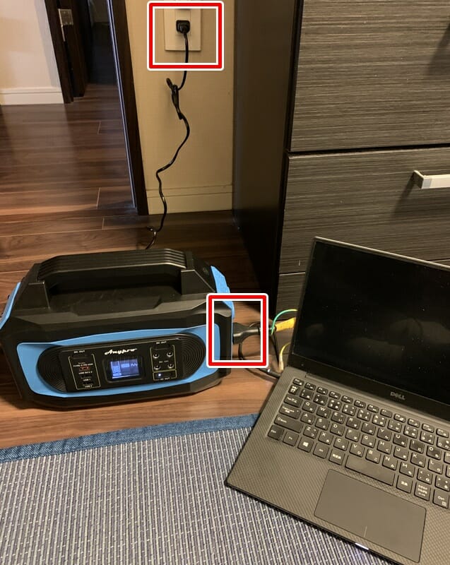 まずポータブル電源にコンセント、もしくはUSBケーブルで電子機器を接続する。
