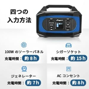 そして入力(充電)方法には『ACコンセント』『ジェネレーター』『シガーソケット』『ソーラーパネル』の4種類に対応しているため、場面に応じて柔軟に充電を行うことが出来る。