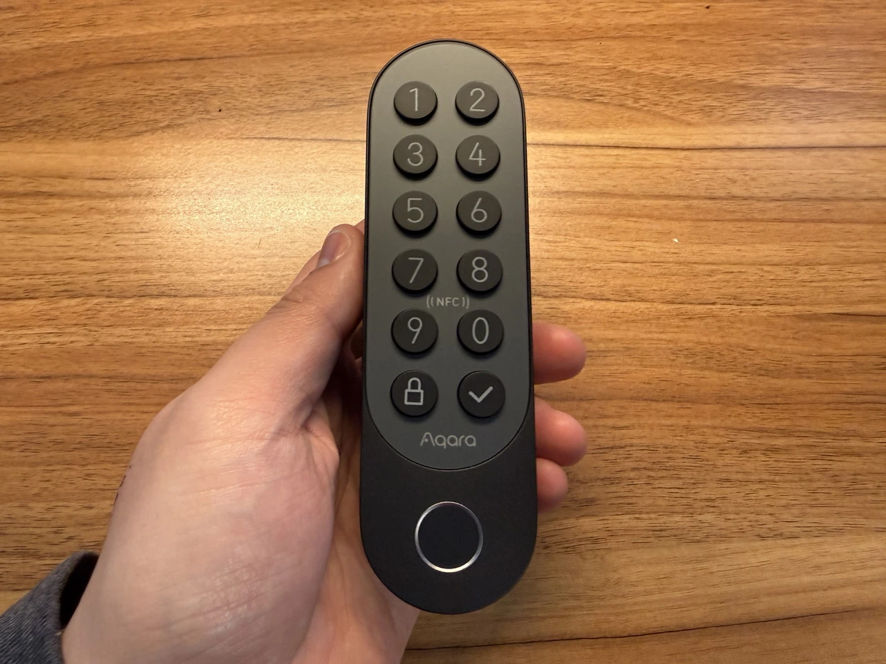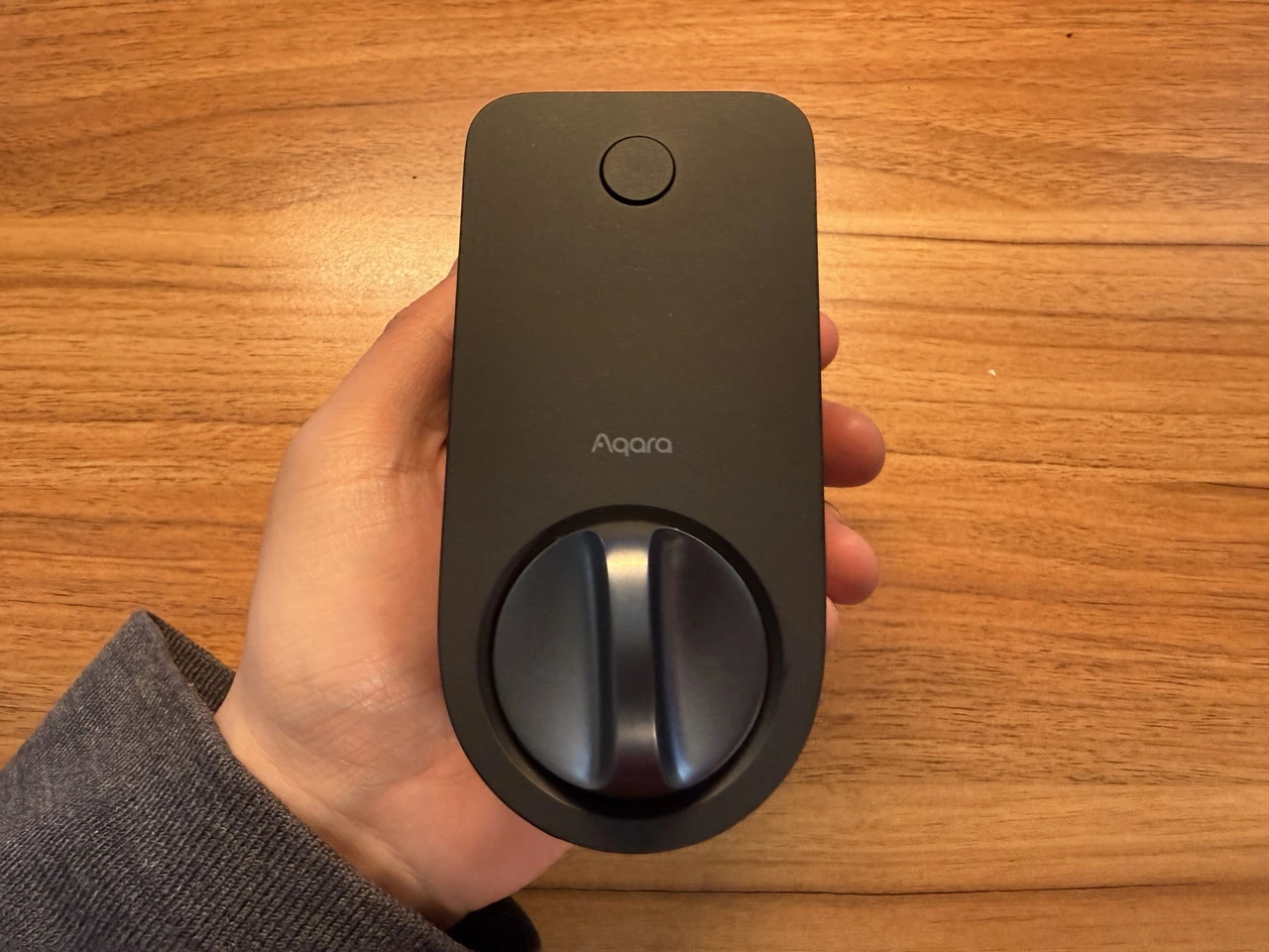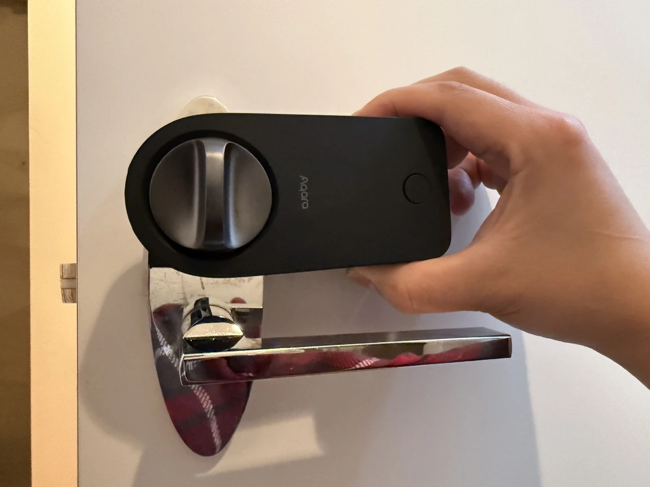 AqaraスマートロックJ200を手に持っている