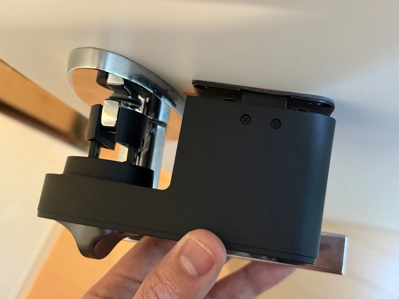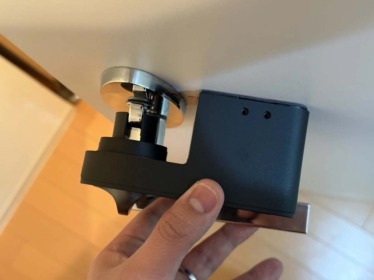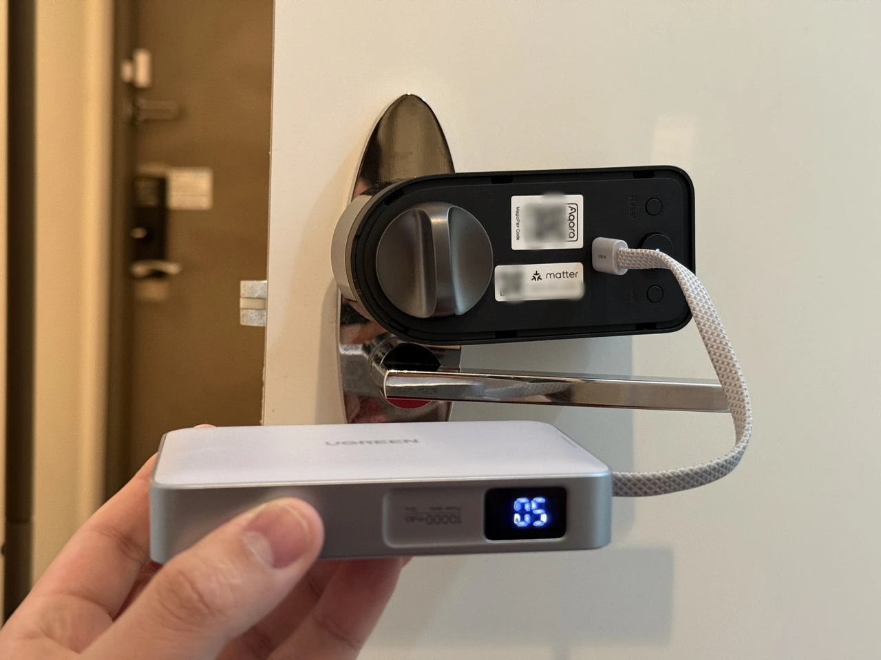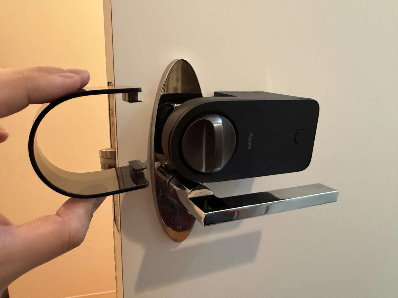AqaraスマートロックJ200を手に持っている