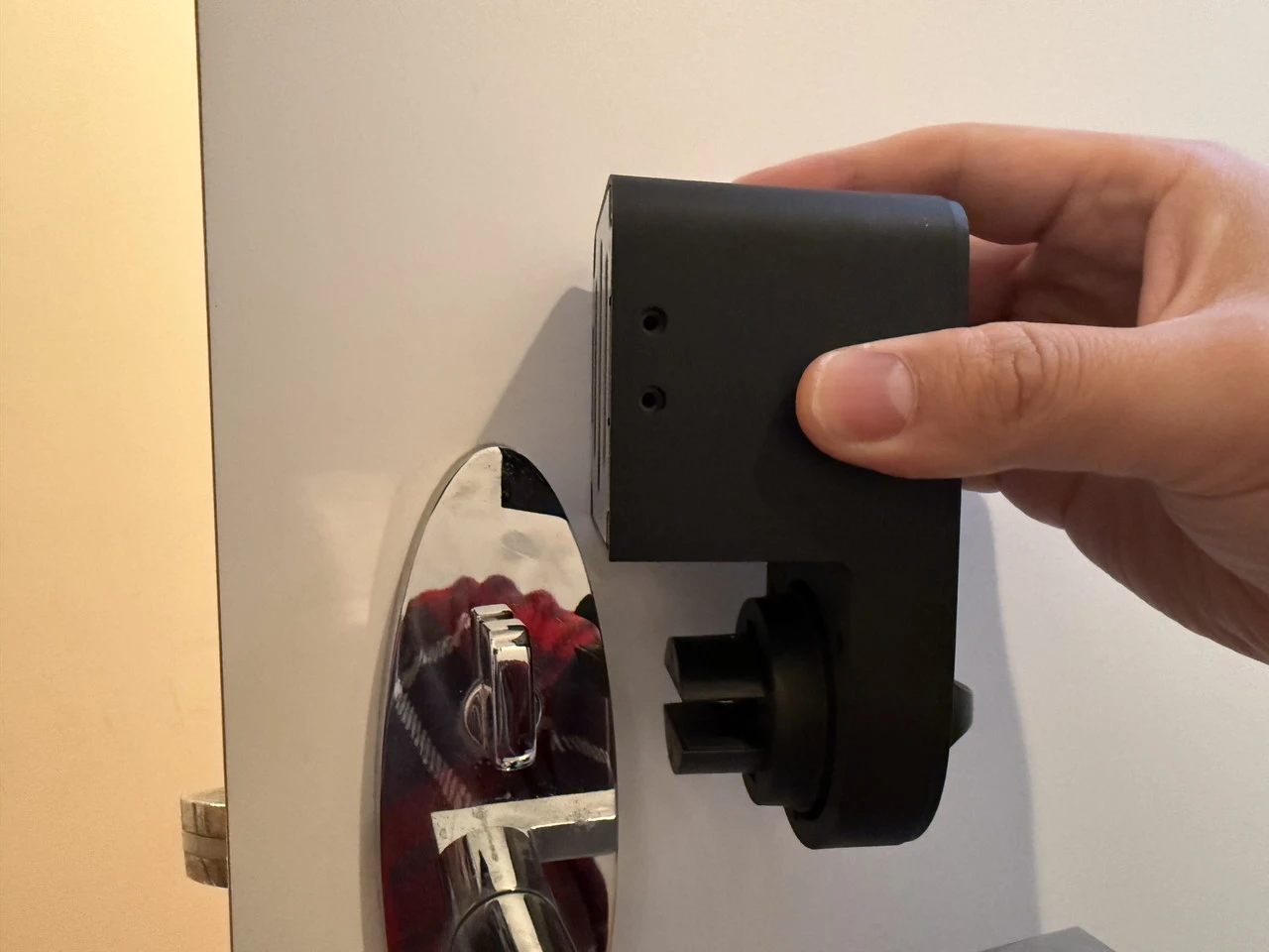 位置を決めたら、スマートロックのサムターンホルダーが、きちんとサムターンを挟めるかを確認します。
