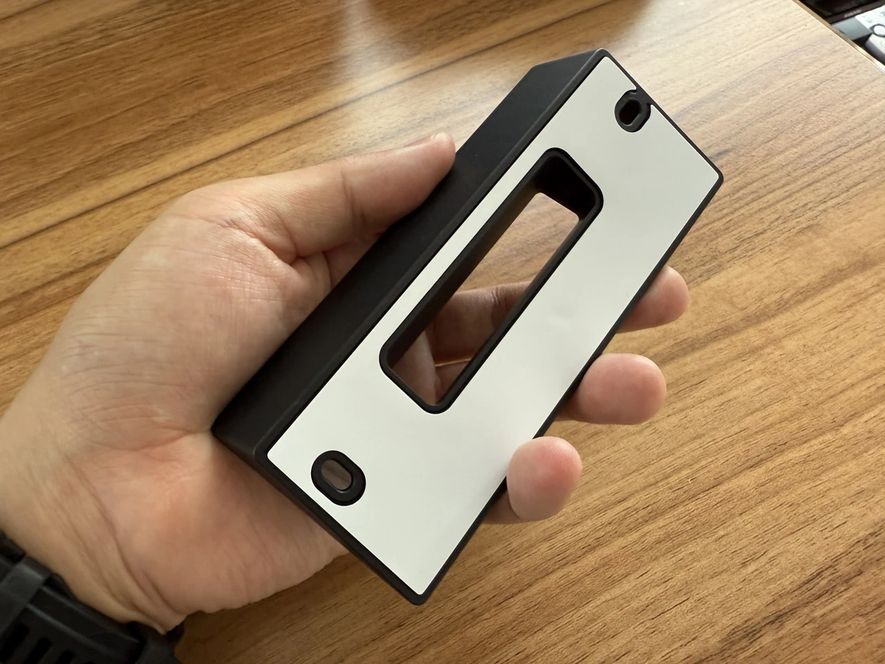 ▼背面の様子。両面テープが貼られているほか、付属の金具で固定するための穴が用意されている。