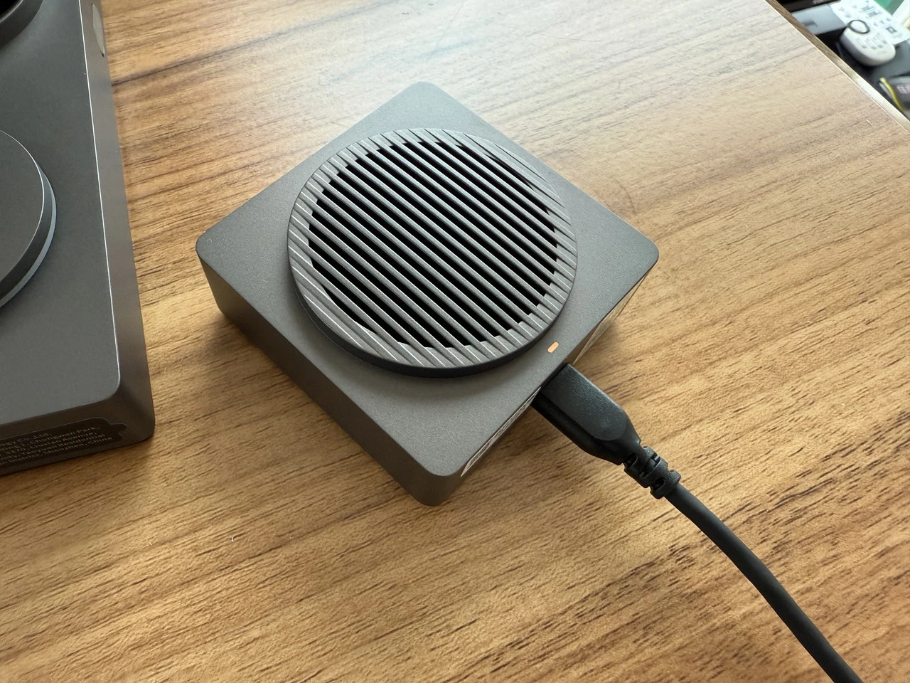 ▼下部の様子。マイクロSDカード挿入部、Type-Cポートに加えて、Appleホームに追加するためのQRコードが貼られている。