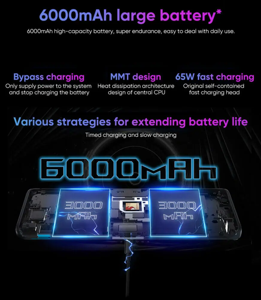 バッテリー容量は6,000mAh。一般的なスマホと比べて大容量となっている。65W高速充電にも対応しているなど、利便性に優れた構成となっている。