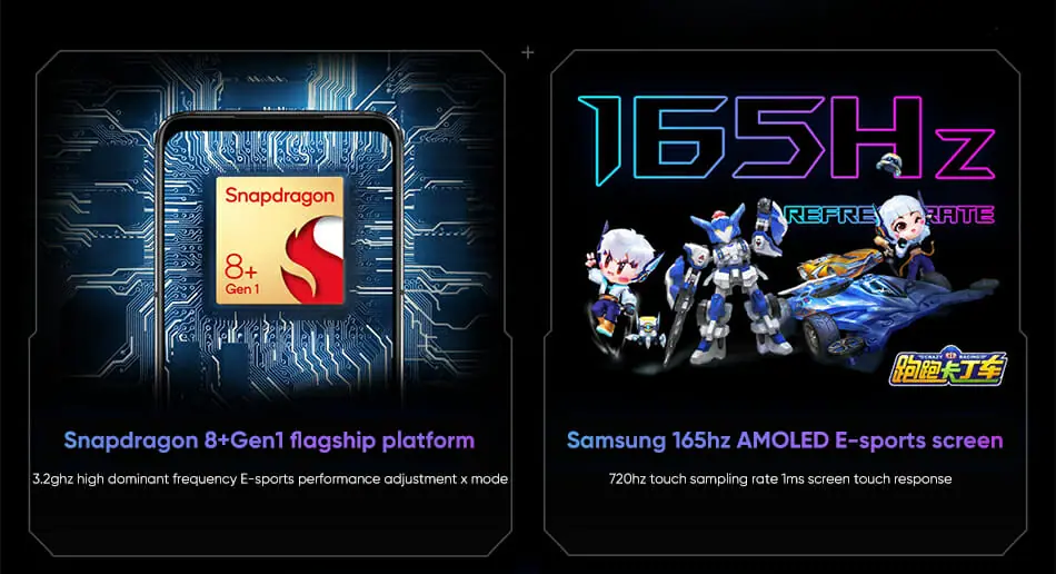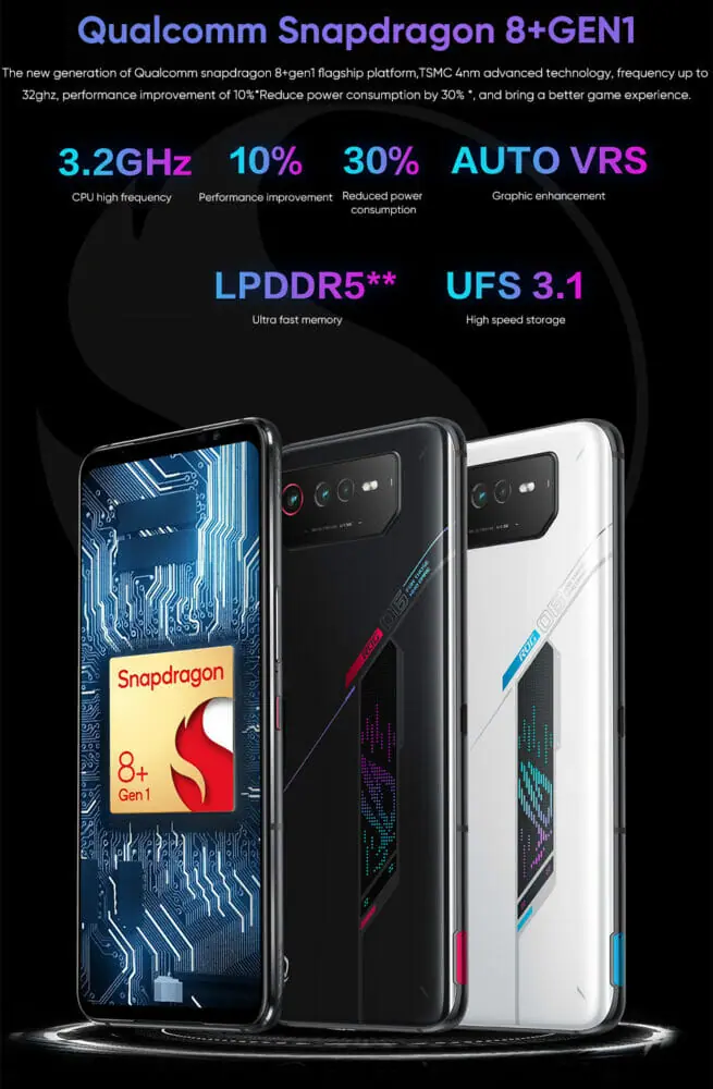 CPU(SoC)には最新のQualcomm Snapdragon 8+ Gen 1 オクタコアプロセッサーを採用しており、RAMは最大16GB、ストレージは最大512GB搭載モデルが用意。ハイエンド機種といって差支えのない性能を発揮するゲーミングスマホとなっている。
