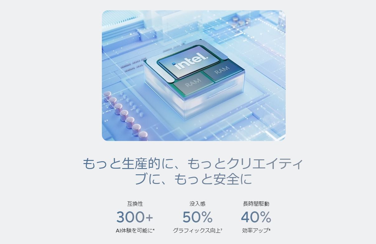 | AI機能 | インテル® AI Boost (NPU AI エンジン) (最大 47 TOPS) | インテル® AI Boost (NPU AI エンジン) (最大 40 TOPS) | ||||||