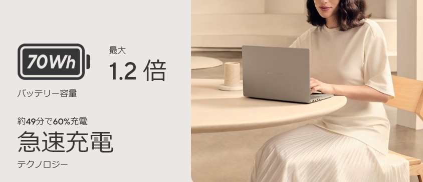 こちらも超軽量設計、薄型デザイン、長時間持続可能バッテリー、優れた耐衝撃性などにより、外出先での利用にも適したノートPCとなっています。
