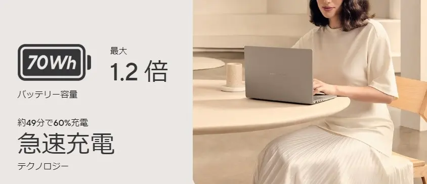 一方で「ASUS Zenbook SORA UX3407RA」の重量は約980gと、UX3407QAと比べて90gほど重いですが、十分に軽量な部類です。約29時間のバッテリー持続力を誇り、外出先でも長時間の連続使用が可能。14インチの有機ELディスプレイを採用し、1920×1200(FHD)解像度・60Hzリフレッシュレートをサポート。CPUには「Qualcomm® Snapdragon® X Eliteプロセッサー」を搭載し、よりパワフルなパフォーマンスを発揮します。
