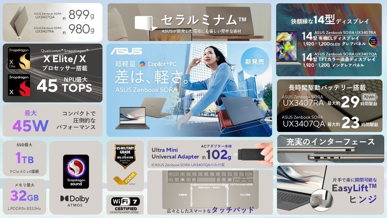 シリーズには「ASUS Zenbook SORA UX3407QA」および「ASUS Zenbook SORA UX3407RA」の2製品が含まれており、いずれも2025年2月5日(水)に発売となります。