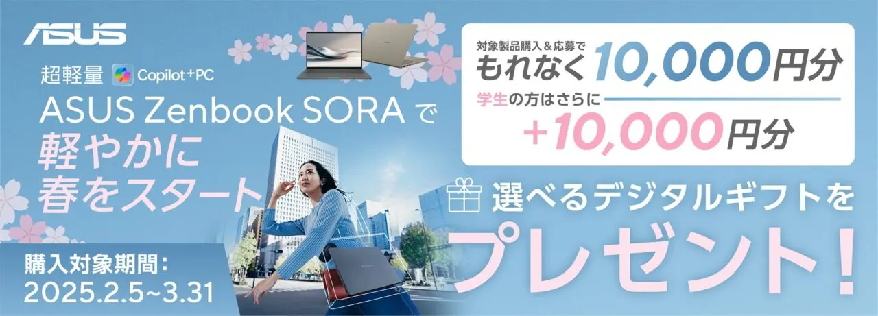 なお、同製品の発売にあわせて、「Zenbook SORAで軽やかに春をスタート!キャンペーン」が実施されています。