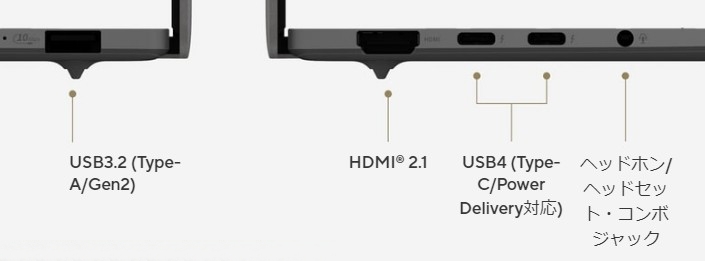 インターフェース HDMI x1, USB4 (Type-C / Power Delivery対応) x2, USB3.2 (Type-A/Gen2) x1, ヘッドホン / ヘッドセットコンボジャック x1