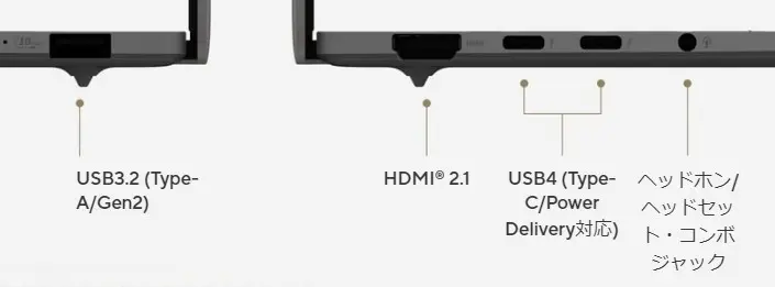 | インターフェース | HDMI x1, USB4 (Type-C / Power Delivery対応) x2, USB3.2 (Type-A/Gen2) x1, ヘッドホン / ヘッドセットコンボジャック x1 |