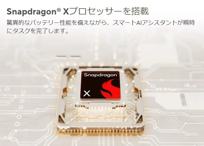 CPUには「Qualcomm® Snapdragon® Xプロセッサー」を、RAMには16GB LPDDR5X-8448を搭載し、パワフルなパフォーマンスを発揮します。