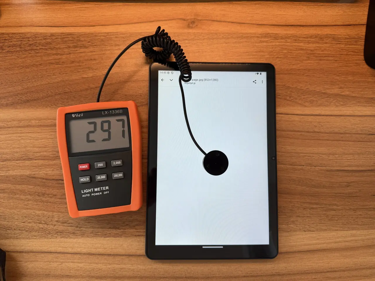 ちなみに、デジタルルクスメーター「Vici LX1336B」を使用して画面の明るさを計測したところ、最高297nitの明るさであった。