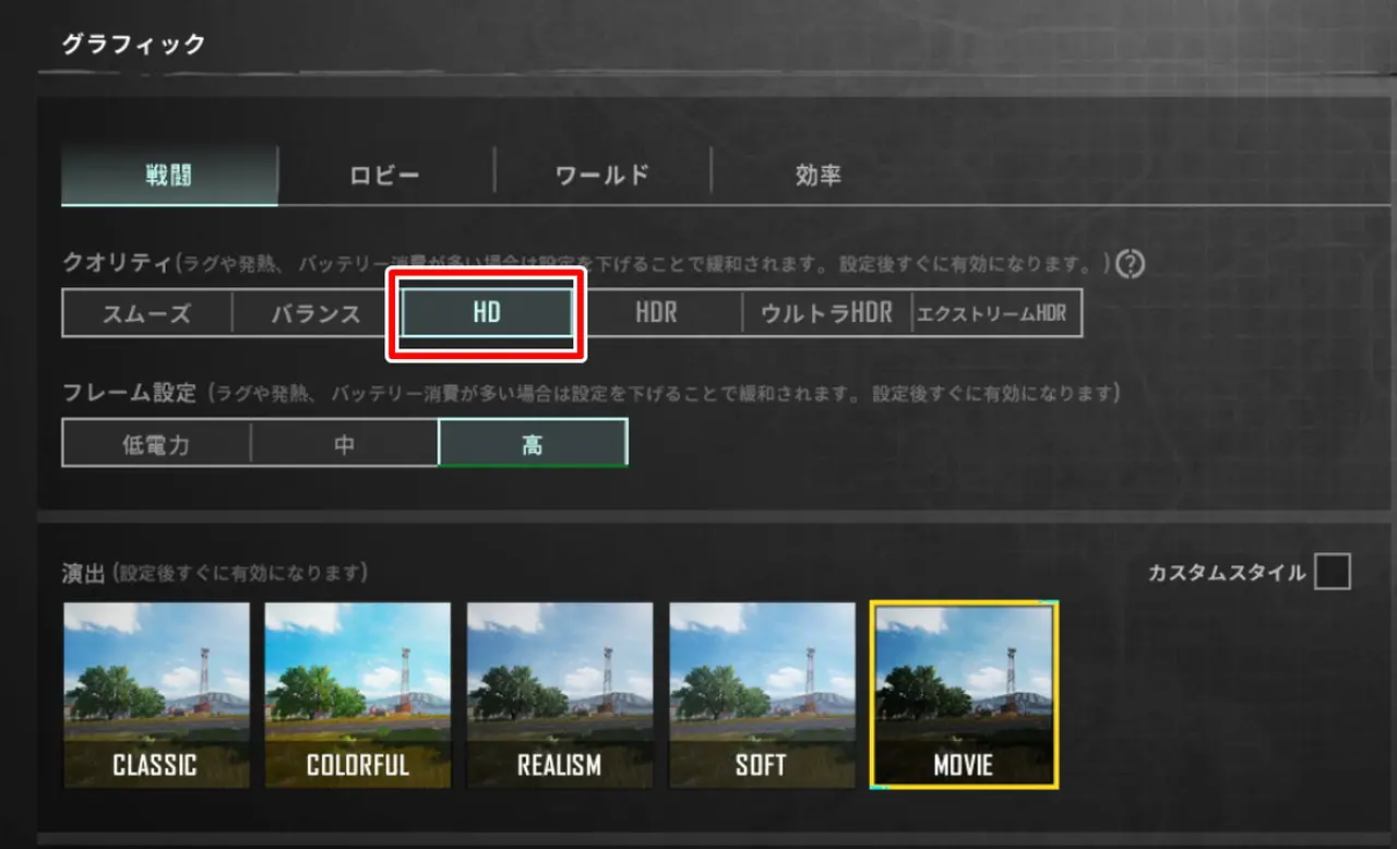 まずグラフィッククオリティに関しては『HD』まで選択できた。
