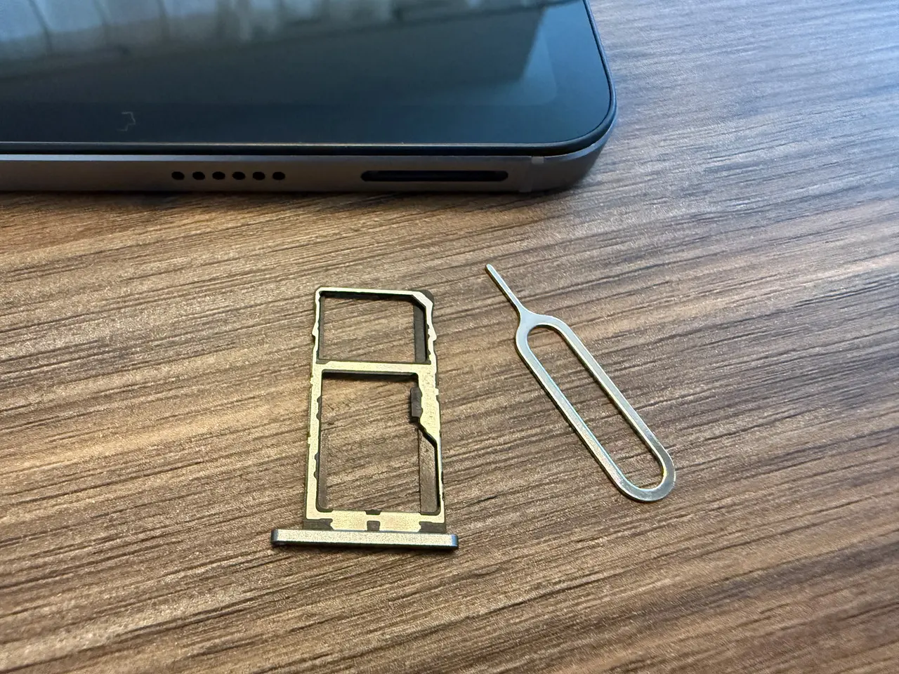 ▼付属のピンでスロットを開き、nanoSIMカードおよびマイクロSDカードの挿入が可能だ。
