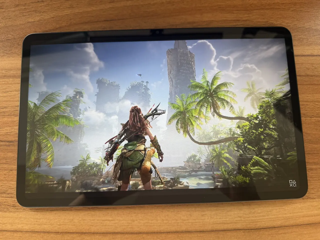 ▼大きめの12インチディスプレイでは迫力のある映像でゲームを楽しめる。仮想コントローラーの各ボタンの間隔が広いため、操作もしやすかった。