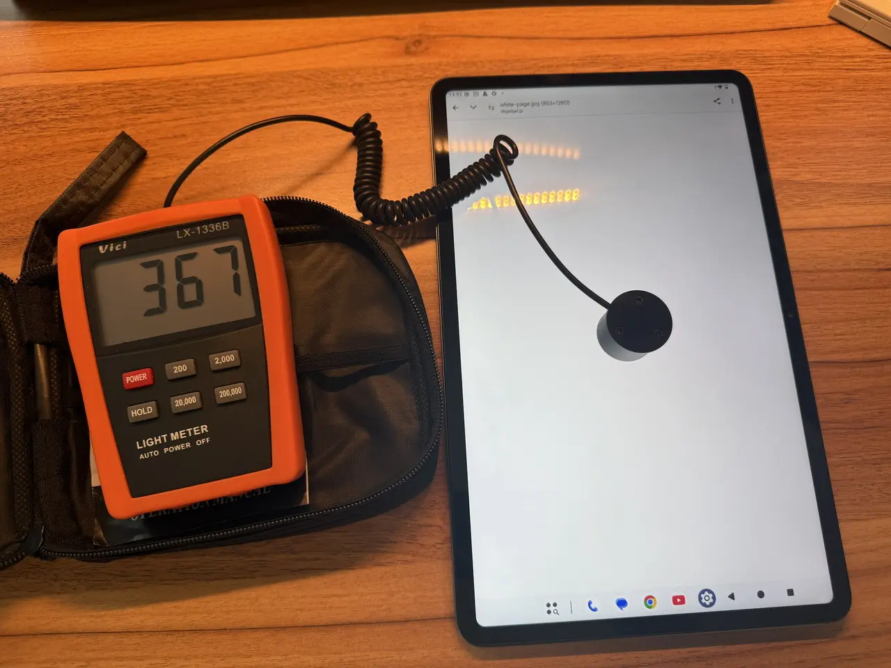 ちなみに、デジタルルクスメーター「Vici LX1336B」を使用して画面の明るさを計測したところ、メーカー公称値通り、最高367nitの明るさであった。