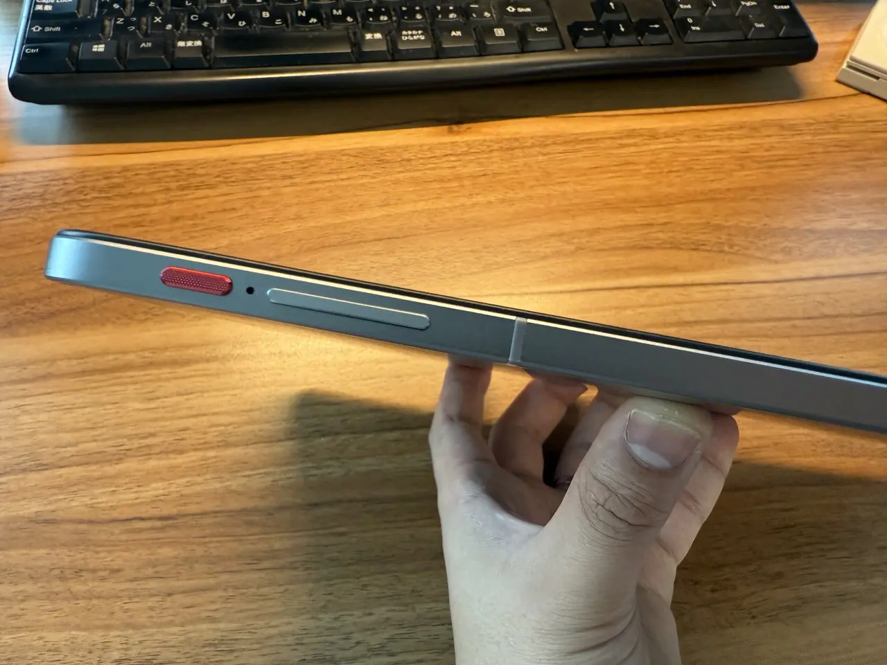 ▼右側面には電源ボタン、音量調節ボタンが用意。電源ボタンは赤く着色されている。