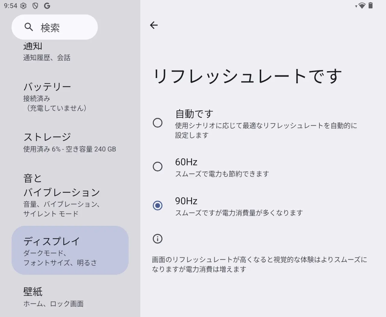 ▼リフレッシュレートは設定アプリより切り替え可能。