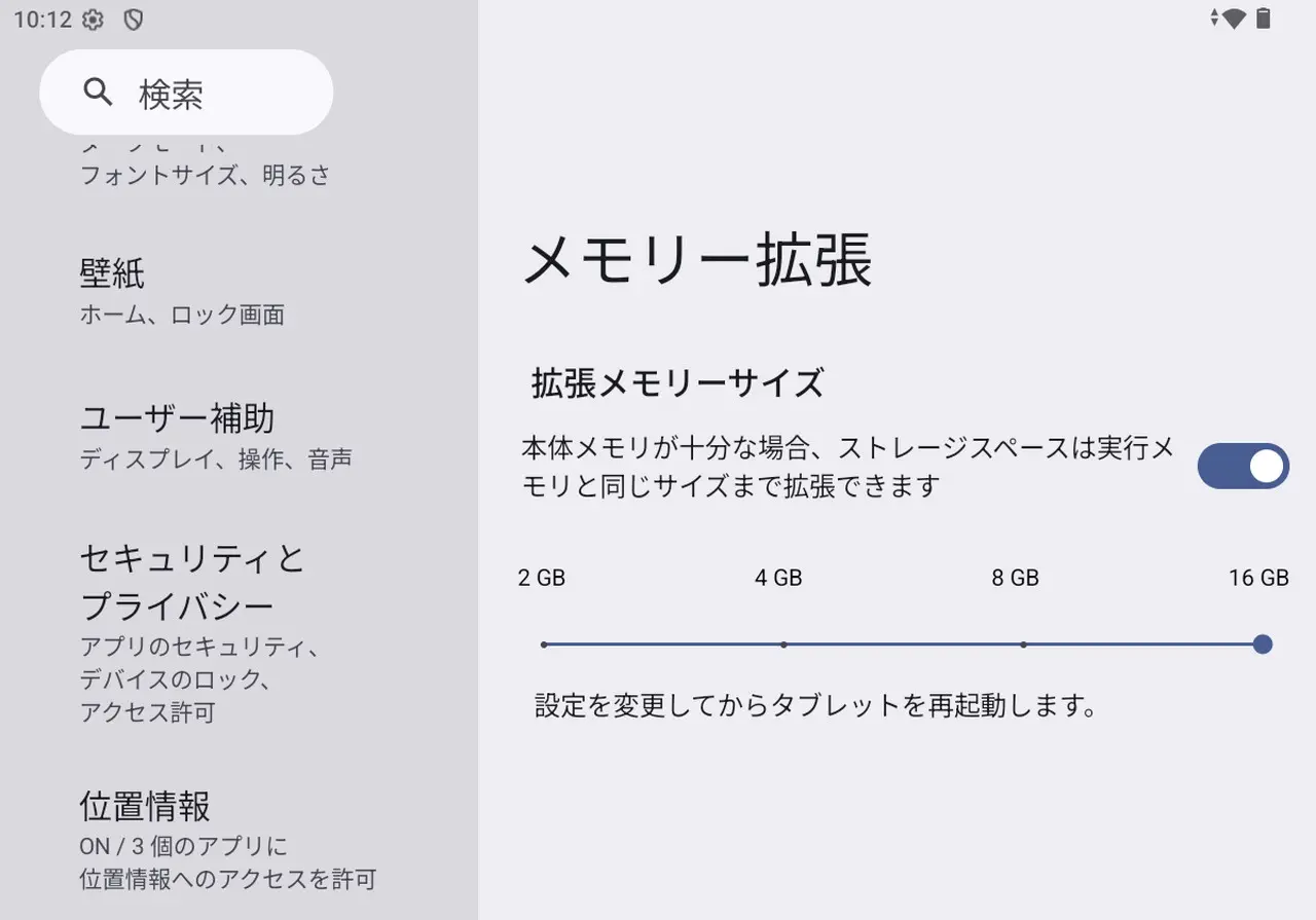 設定より最大16GBの仮想RAM拡張も可能だ。