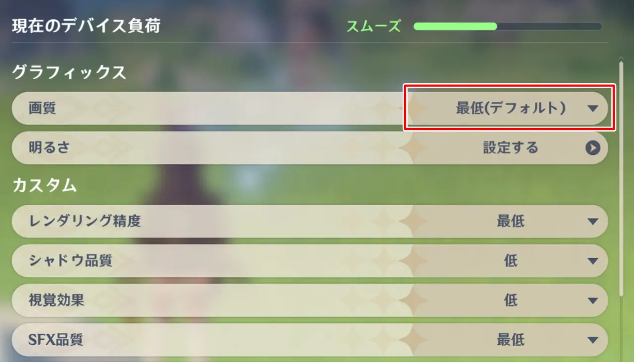 ▼画質設定はデフォルト状態で "最低" に設定されており、デバイス負荷は "スムーズ" の状態。
