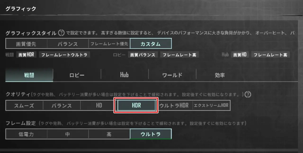 まずグラフィッククオリティに関しては『HDR』までを選択することができた。