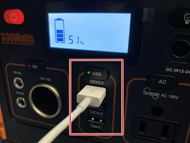 まずUSB出力の場合、ポータブル電源前面のUSBボタンを押したうえで、デバイスとケーブルで接続する。