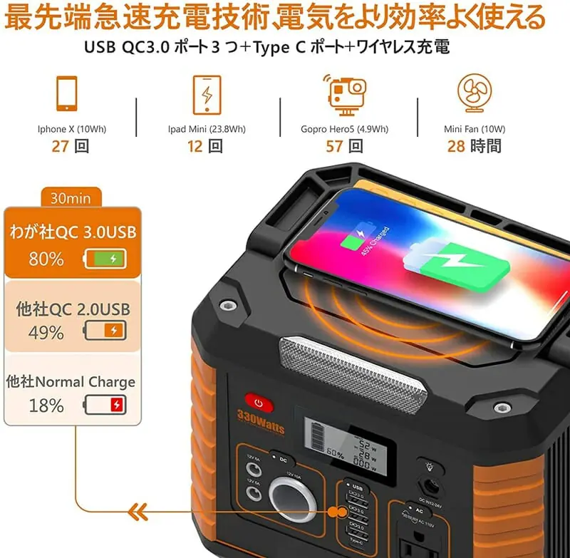 定格出力は330Wであり、スマートフォンやタブレットなどのモバイル端末だけでなく、小型冷蔵庫などの家電も動作させることが出来る。